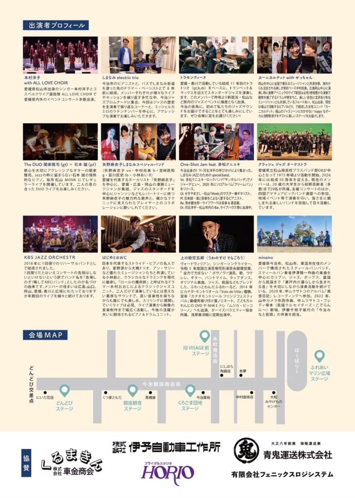 しまなみ海道周辺で活動するジャズミュージシャンを中心とした12グループが集い、上記5カ所にて同時進行でライブを行います!